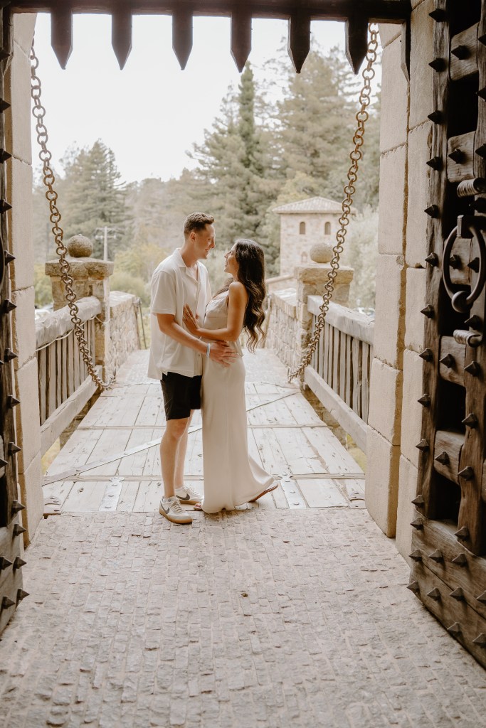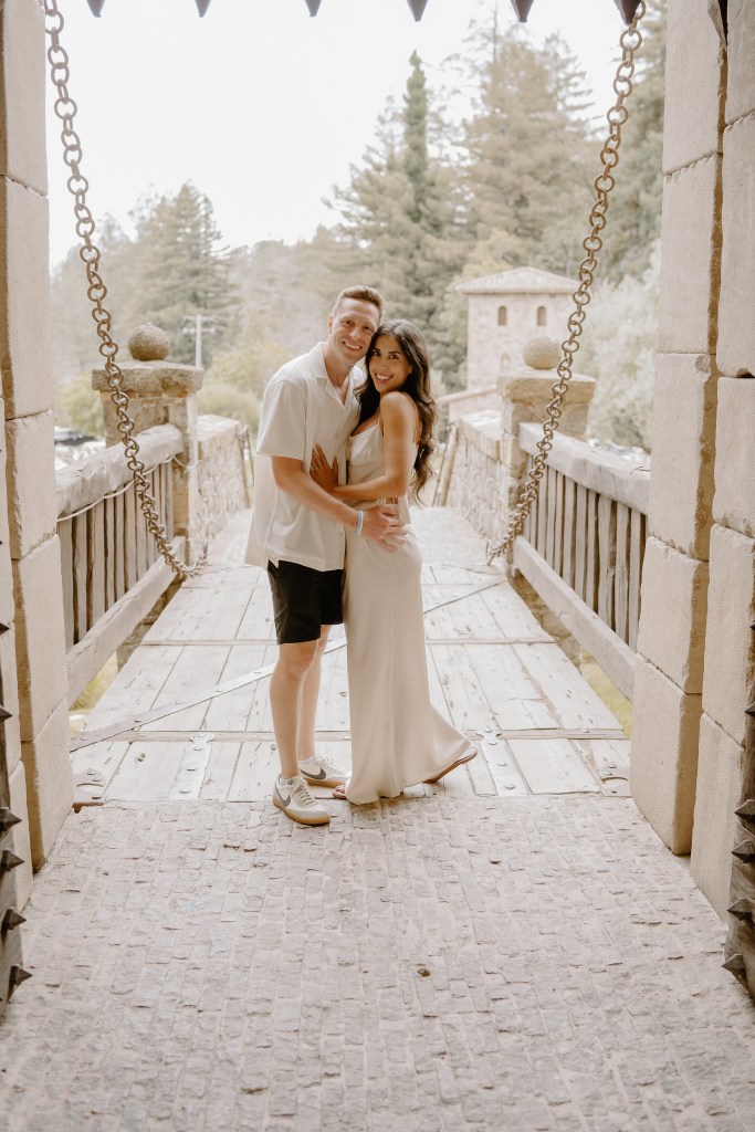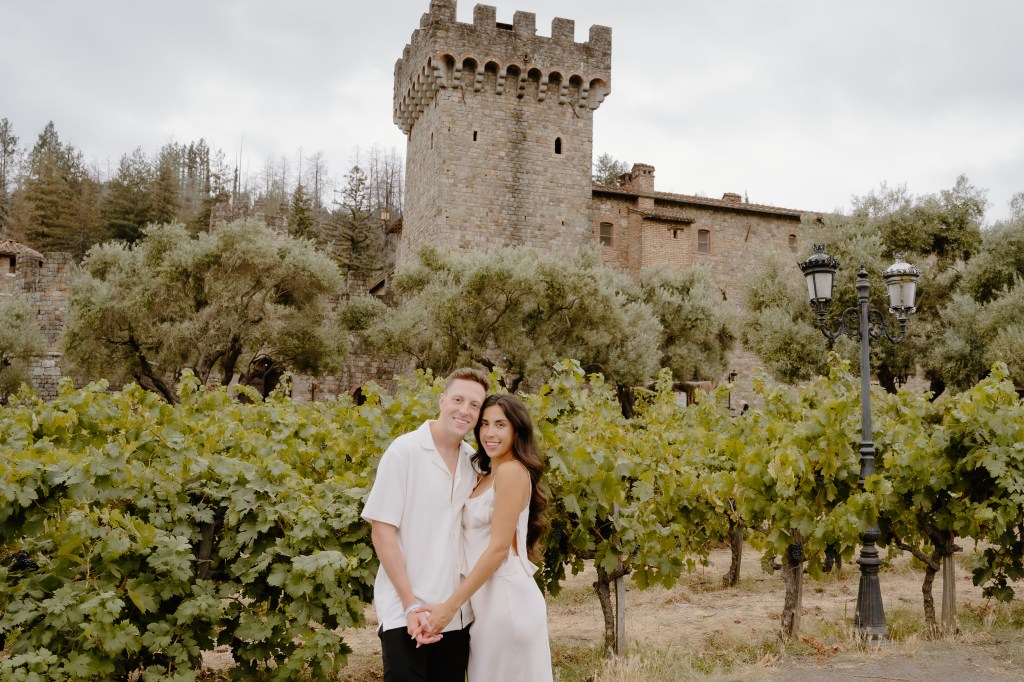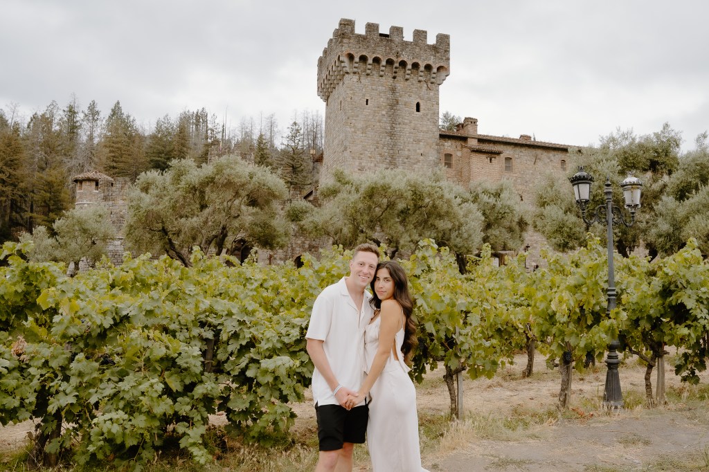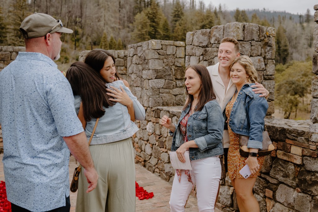 As Sarah arrived at the rooftop terrace, their loved ones were nearby, quietly waiting to witness the special moment. With the castle walls around them and the Napa Valley vineyards stretching behind them, Austin got down on one knee and asked the most important question of his life.