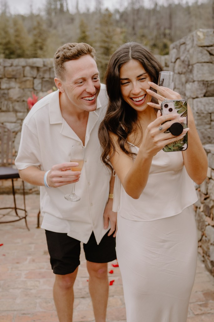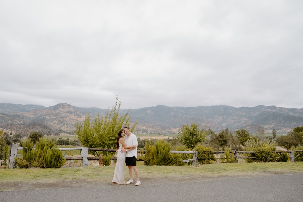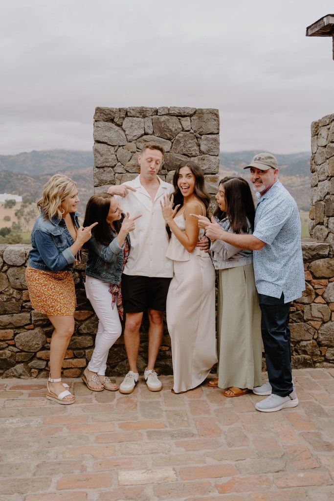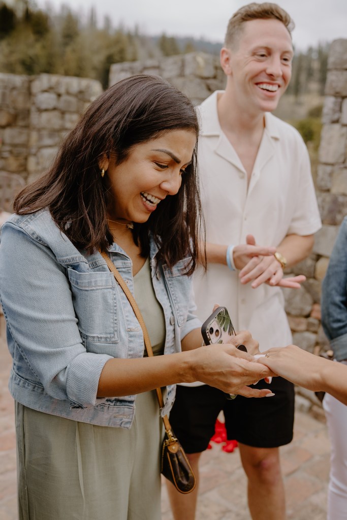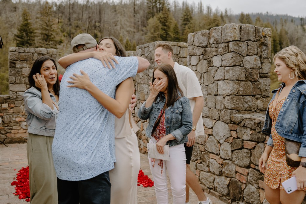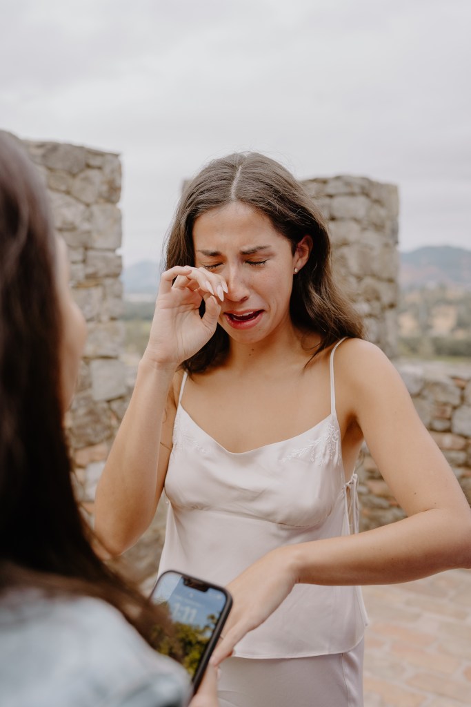 As Sarah arrived at the rooftop terrace, their loved ones were nearby, quietly waiting to witness the special moment. With the castle walls around them and the Napa Valley vineyards stretching behind them, Austin got down on one knee and asked the most important question of his life.