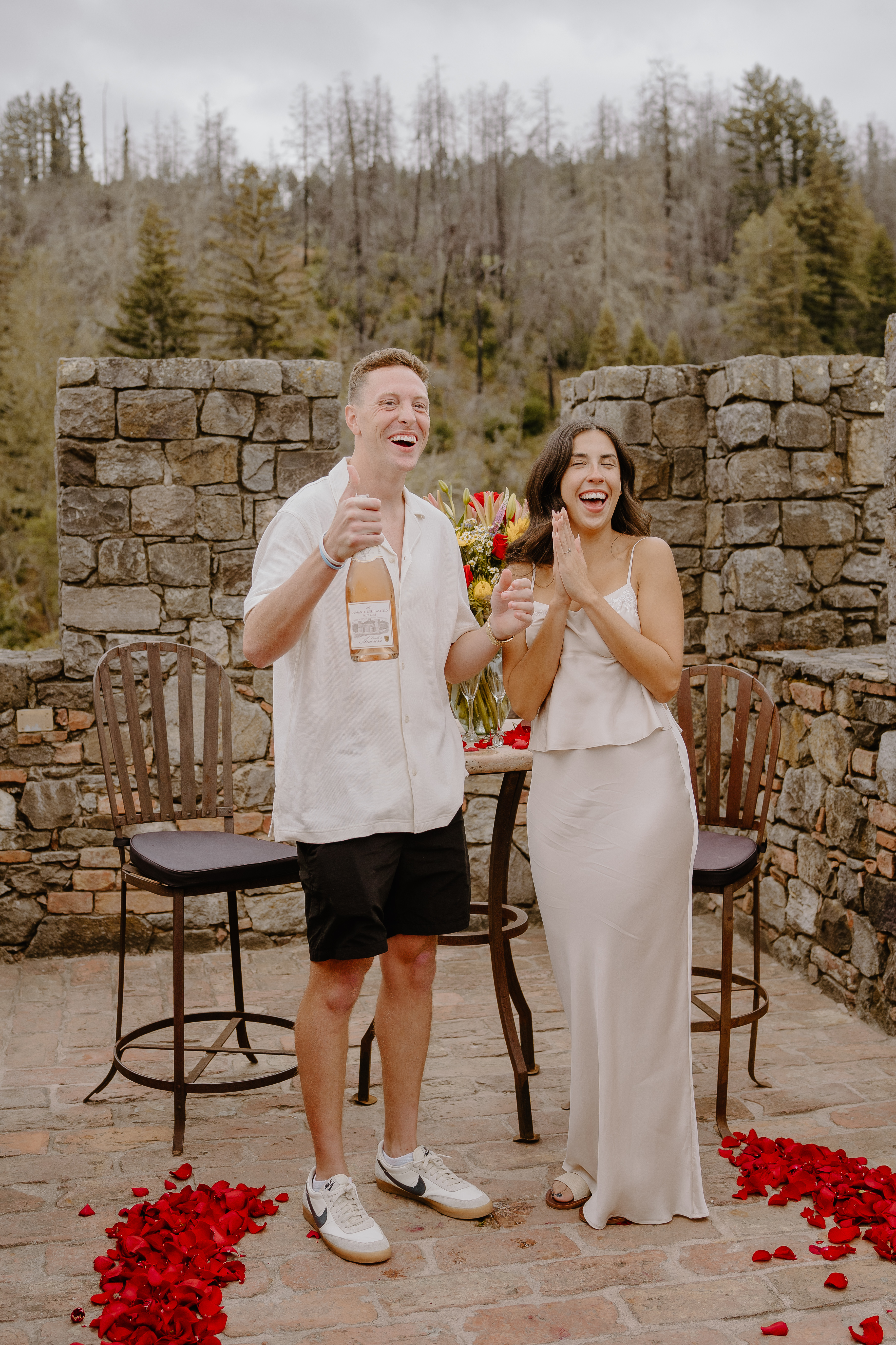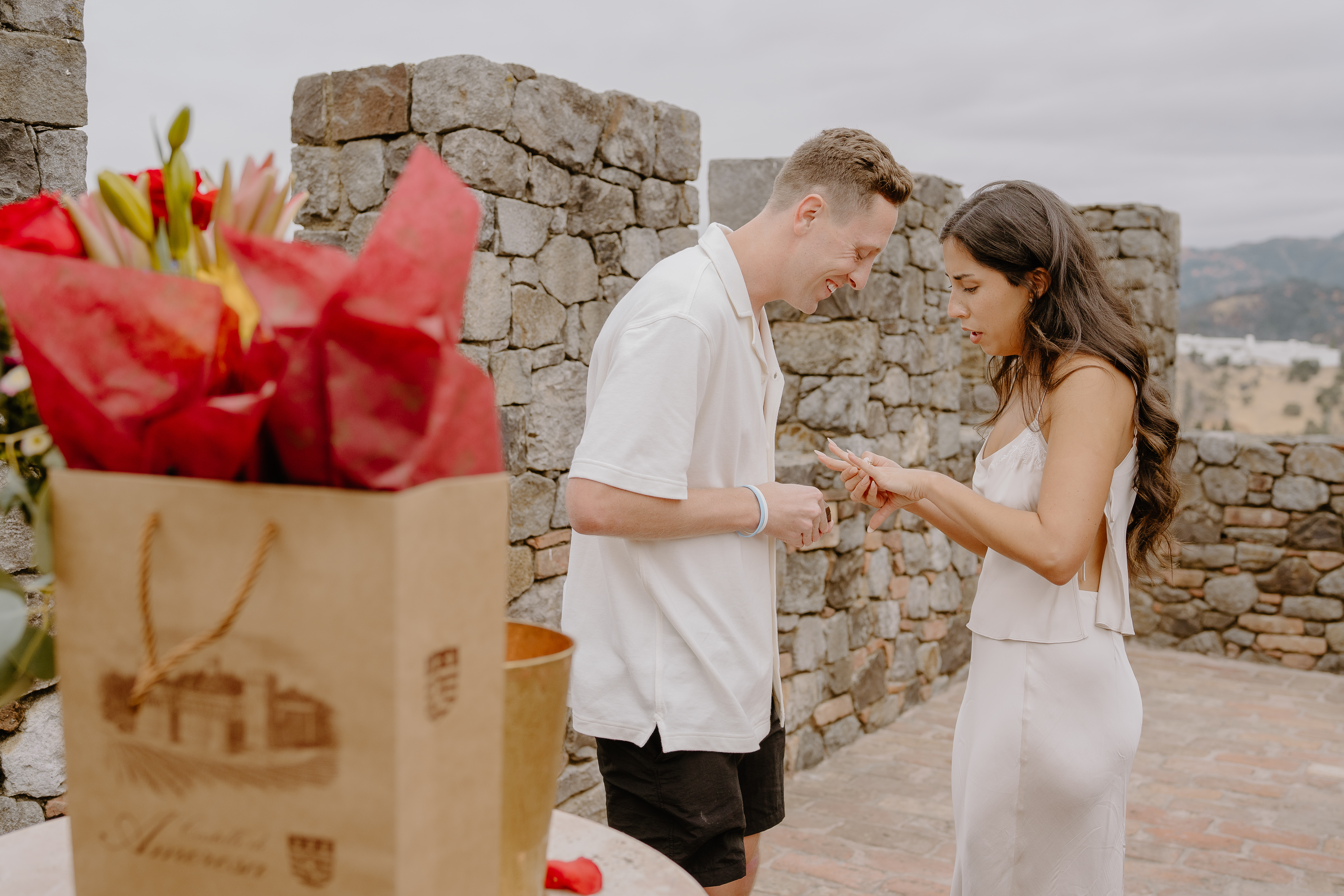 The proposal took place on the rooftop terrace of Castello di Amorosa, one of the most breathtaking spots in Napa Valley. Surrounded by the stone walls of the castle and overlooking the vineyards in the distance, the setting felt both intimate and magical.