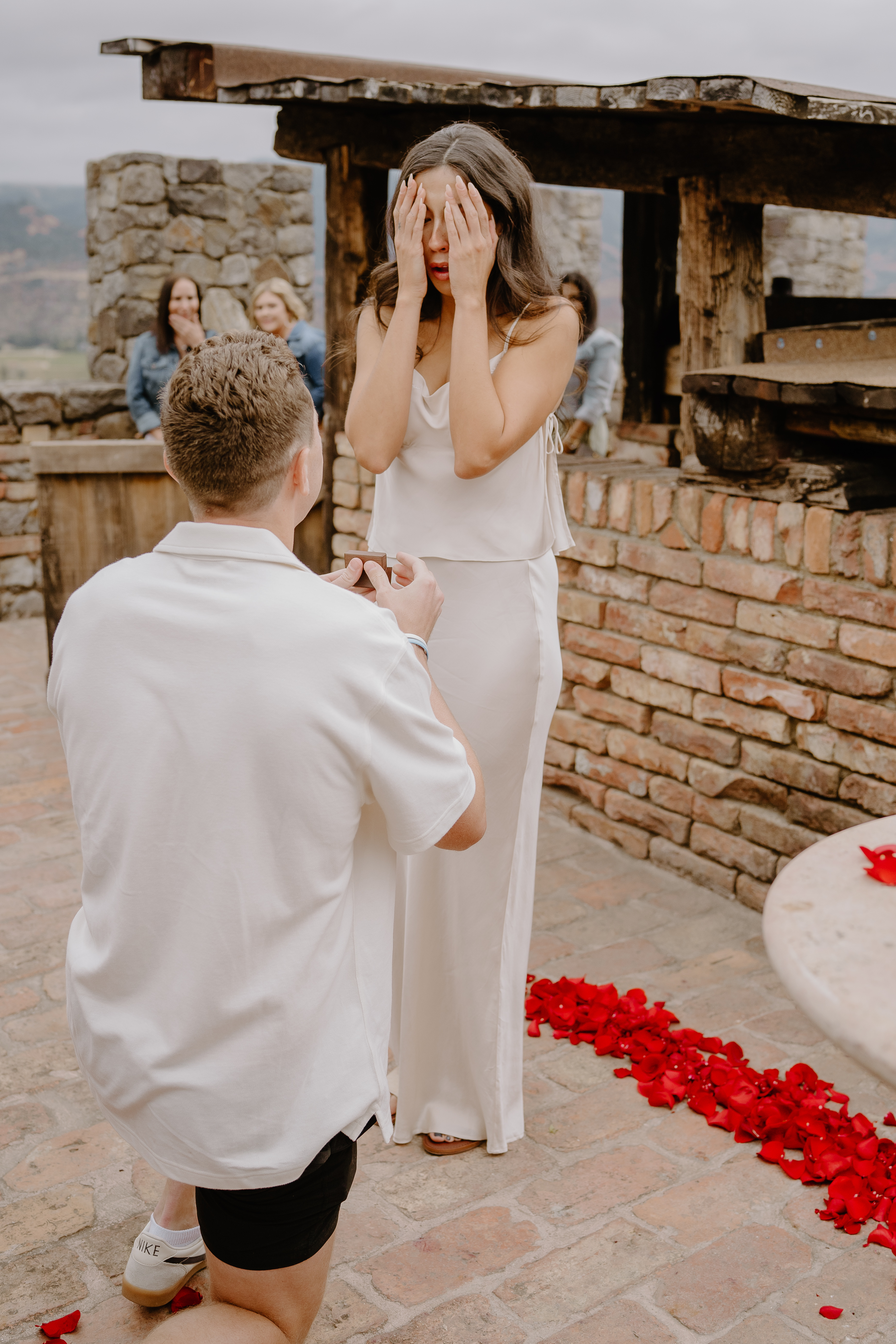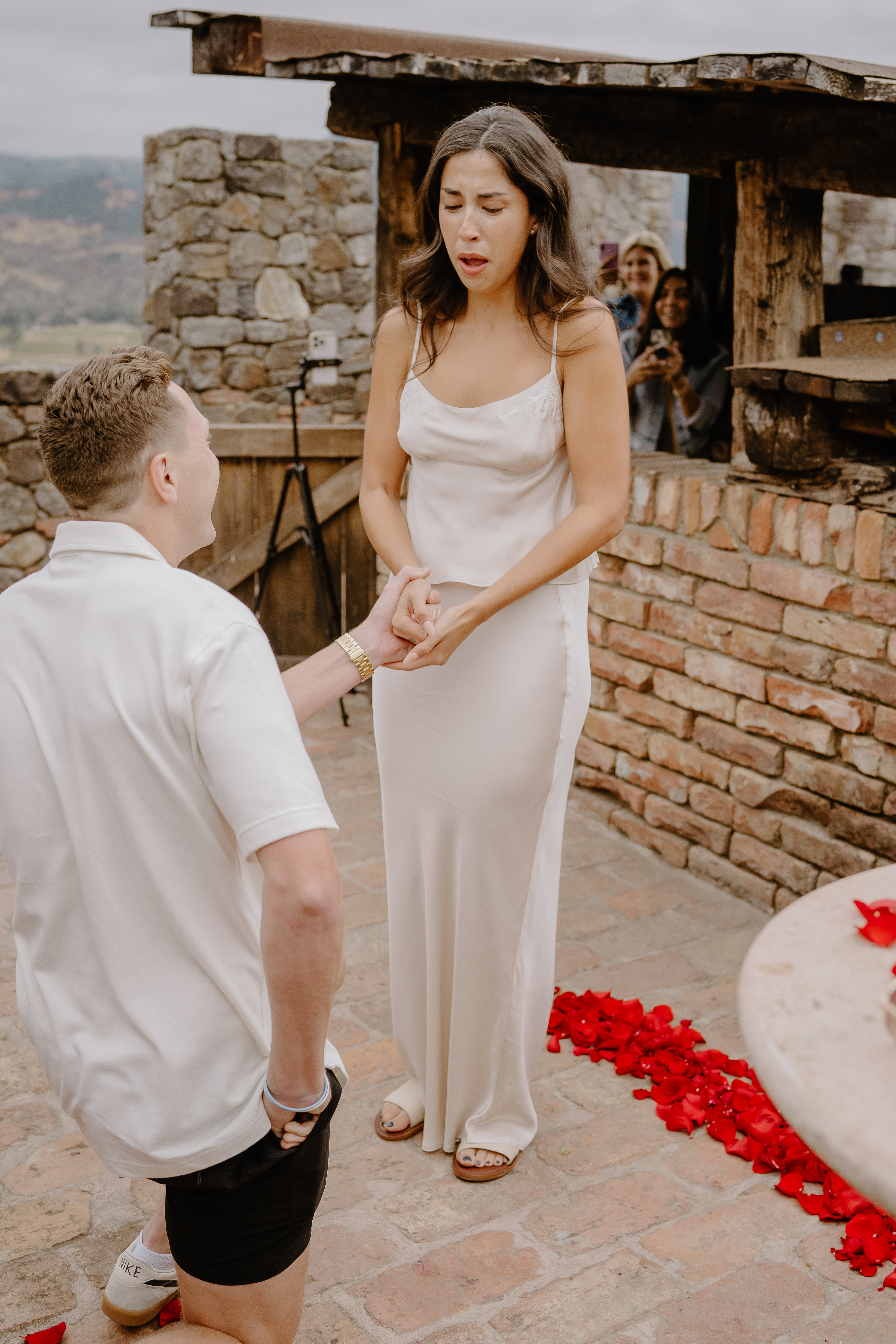 As Sarah arrived at the rooftop terrace, their loved ones were nearby, quietly waiting to witness the special moment. With the castle walls around them and the Napa Valley vineyards stretching behind them, Austin got down on one knee and asked the most important question of his life.