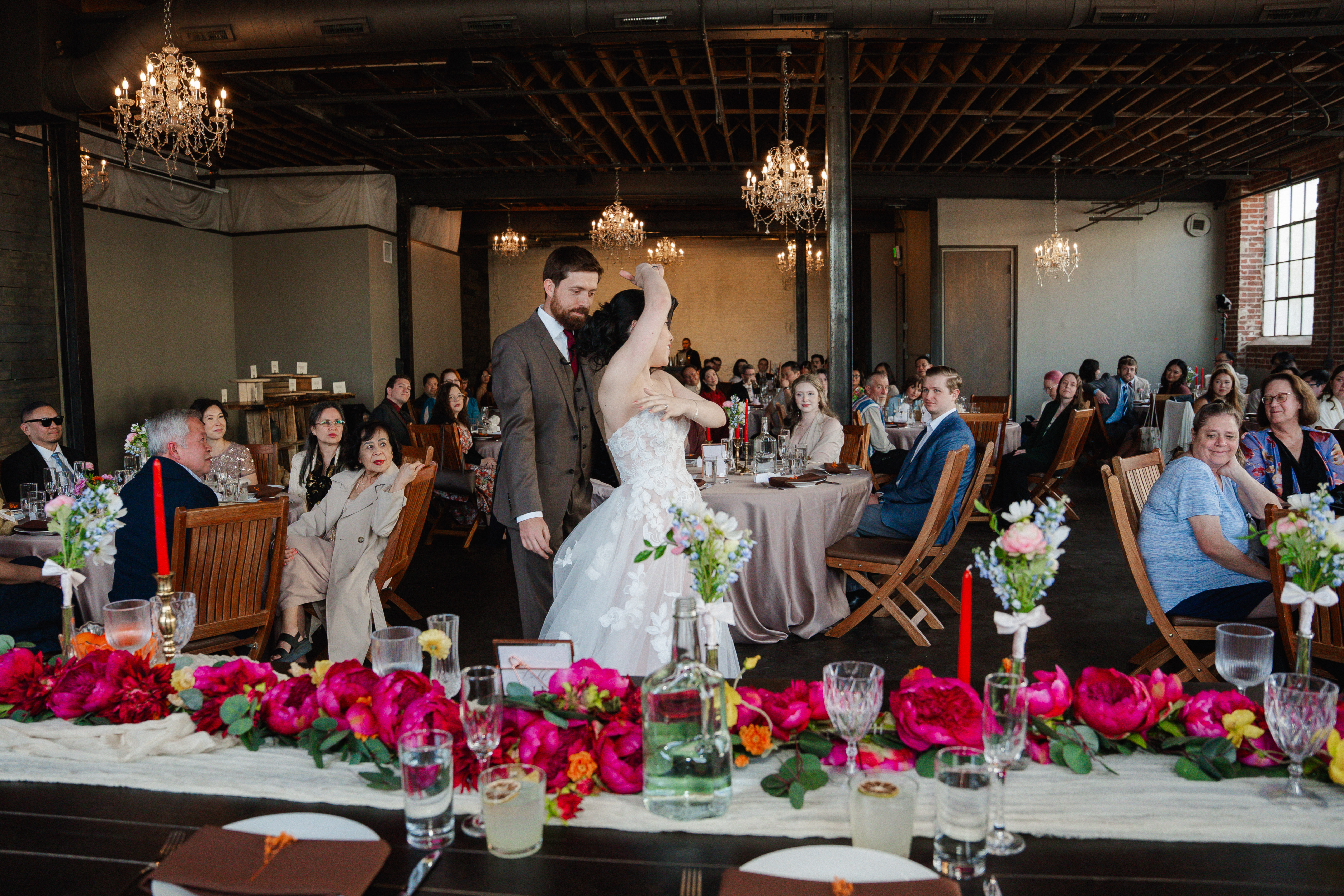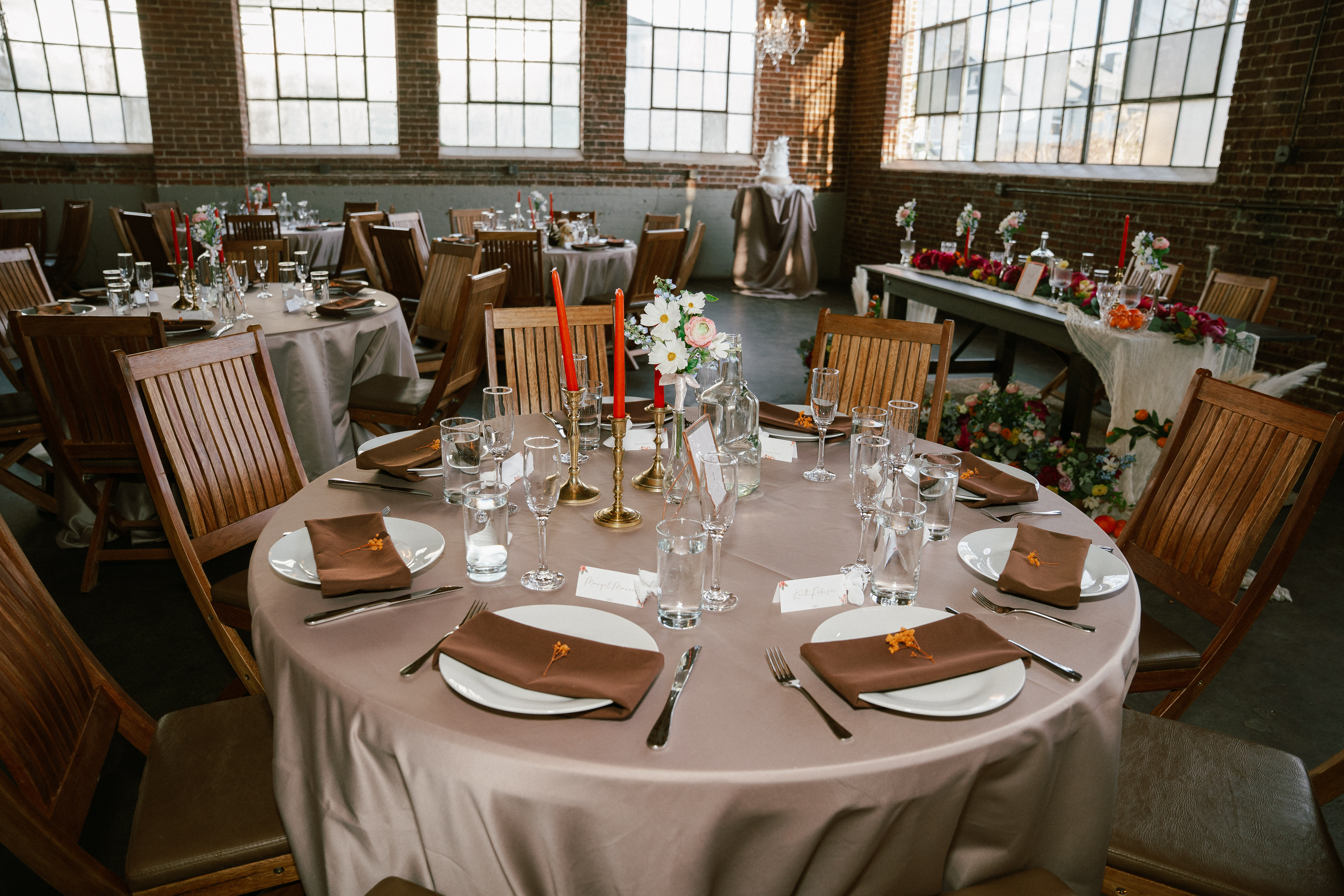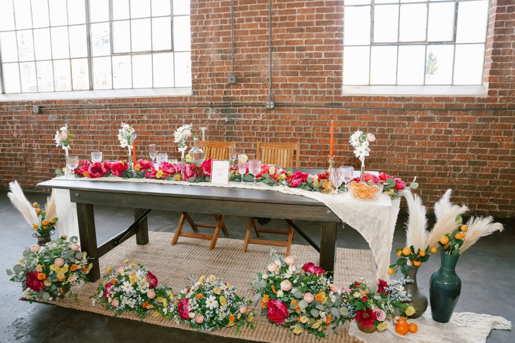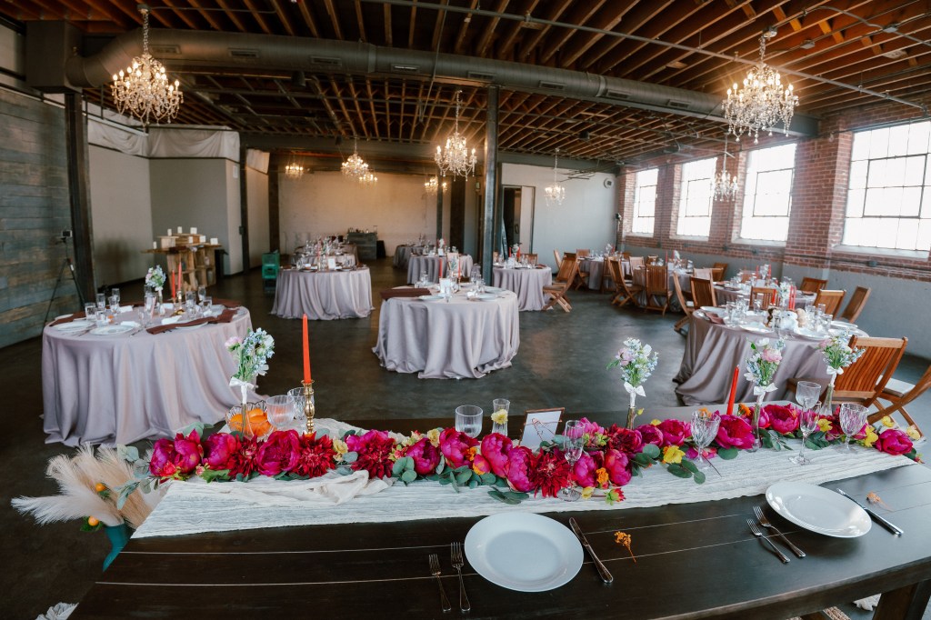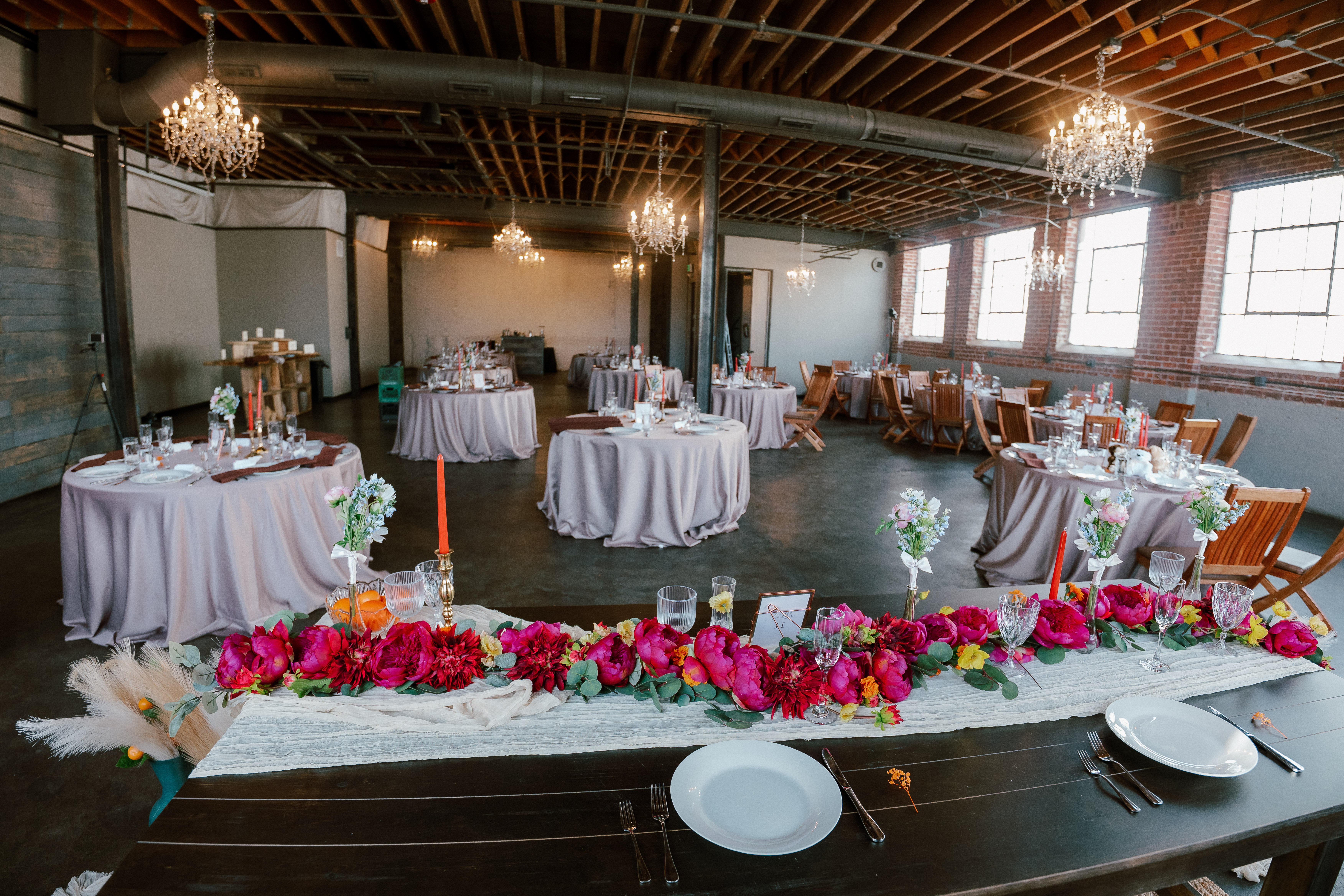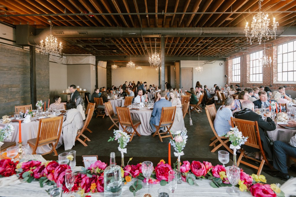 The reception space was filled with vibrant flowers that brought beautiful color throughout the venue. The floral arrangements added a lively and romantic feel that complemented the industrial character of Moss Denver perfectly.