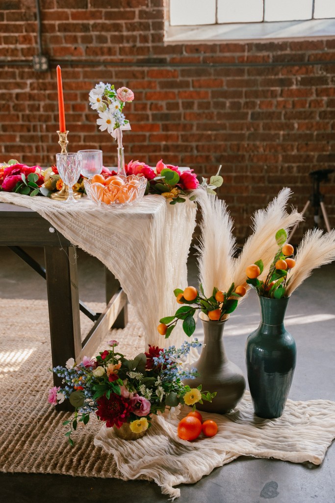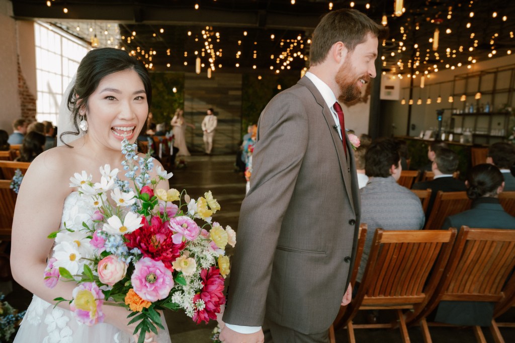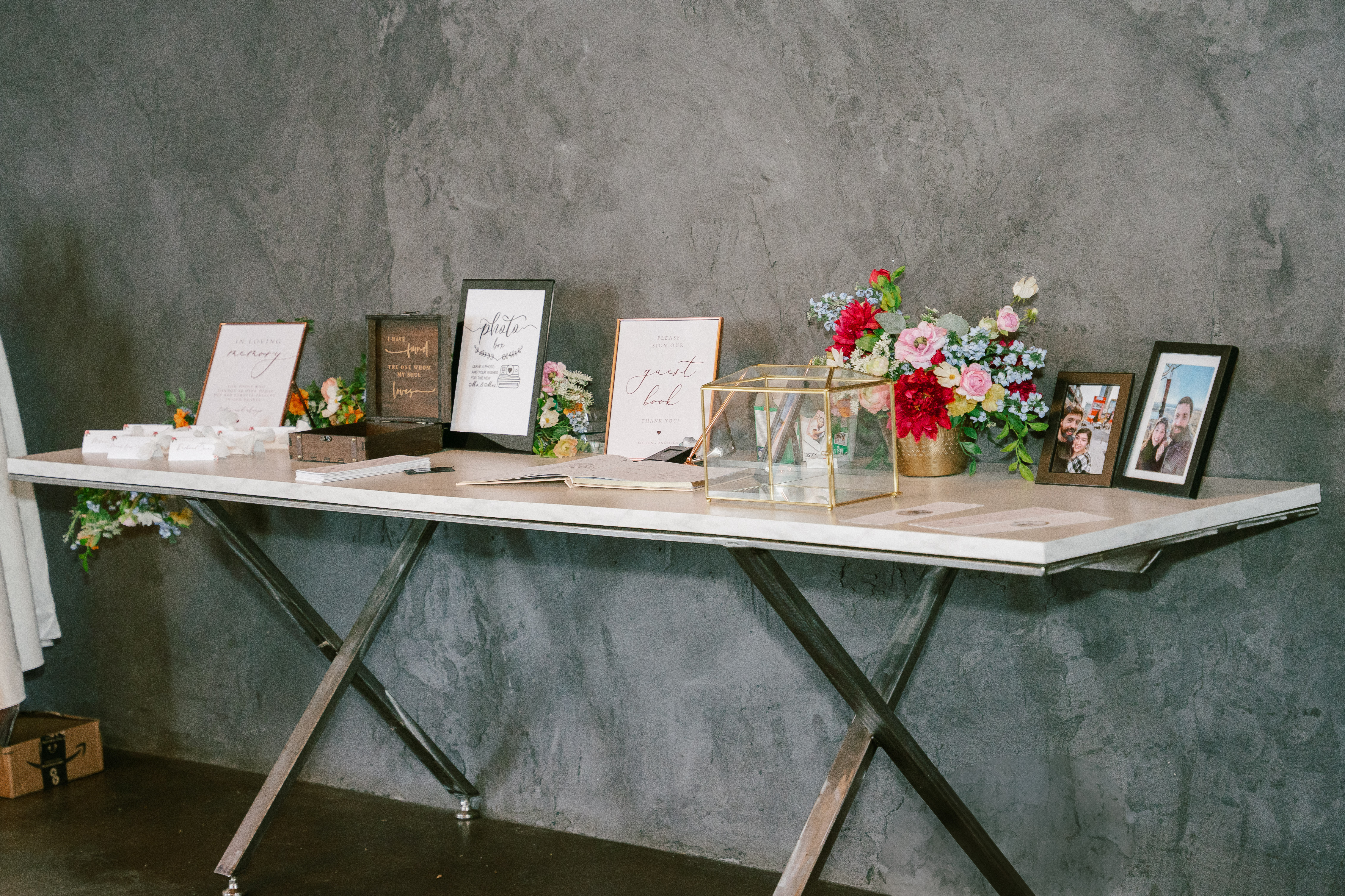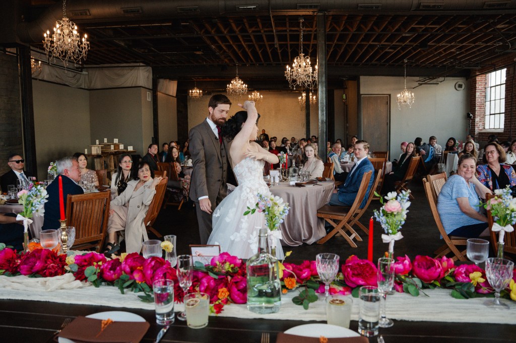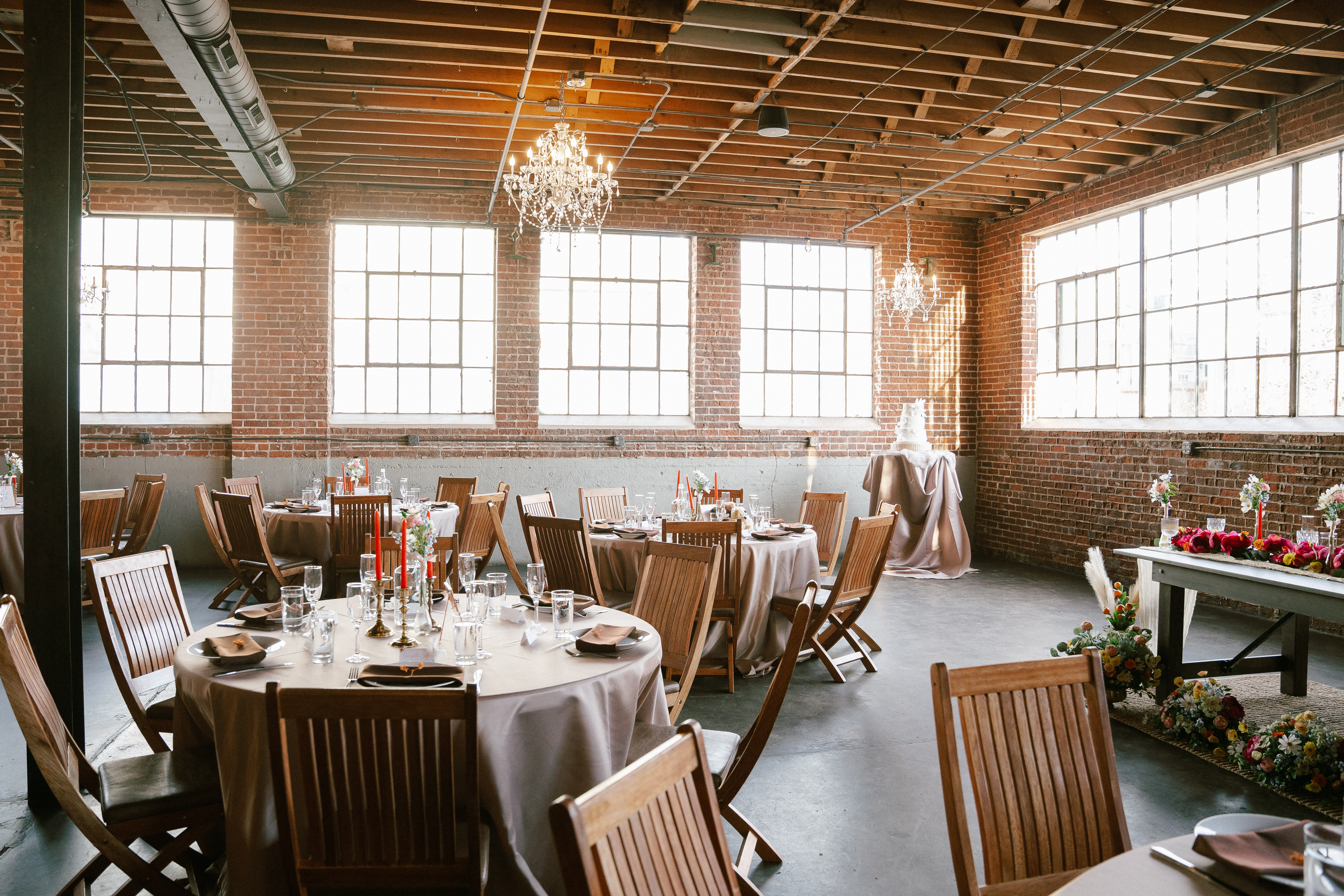 The reception space was filled with vibrant flowers that brought beautiful color throughout the venue. The floral arrangements added a lively and romantic feel that complemented the industrial character of Moss Denver perfectly.