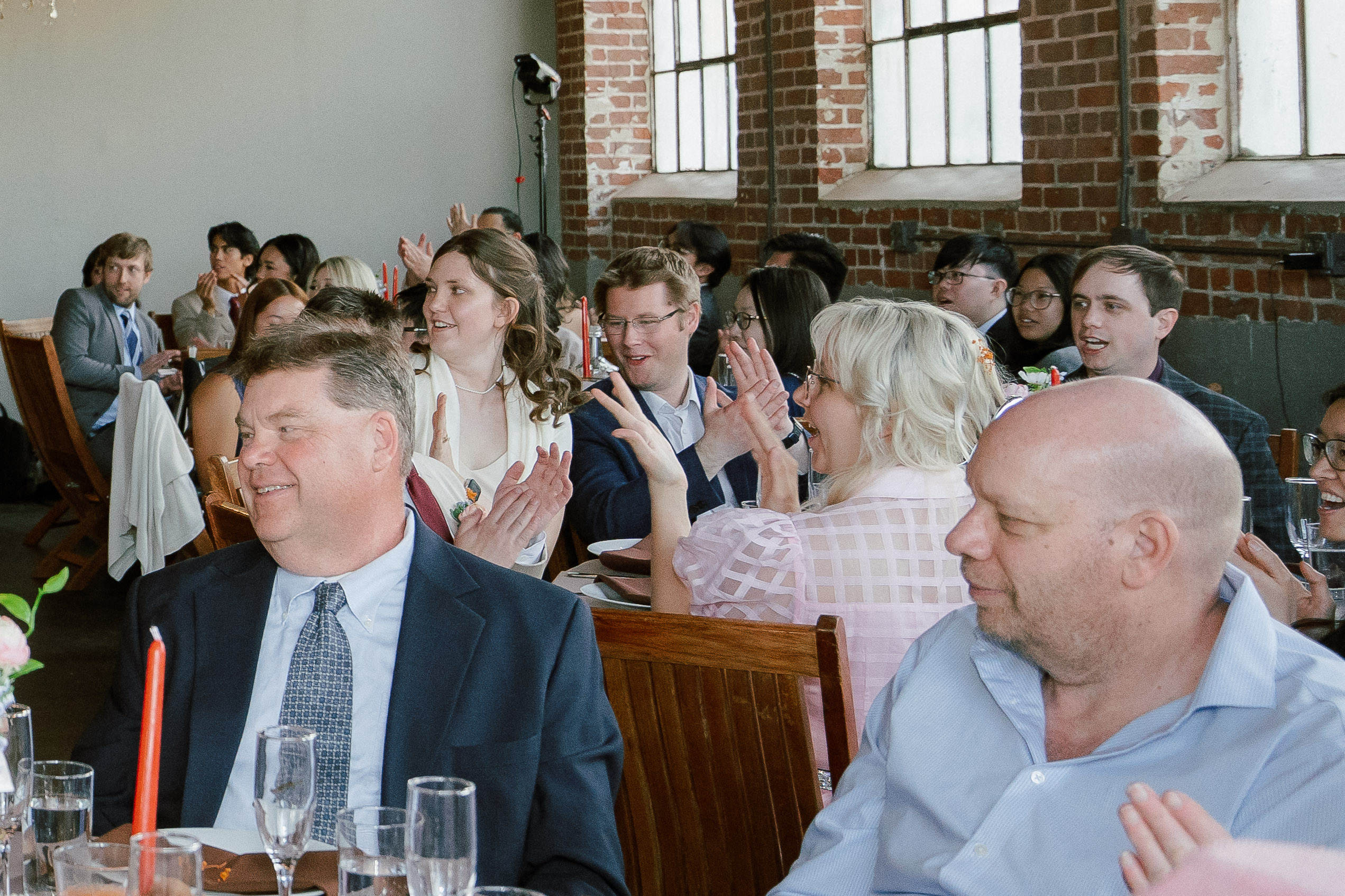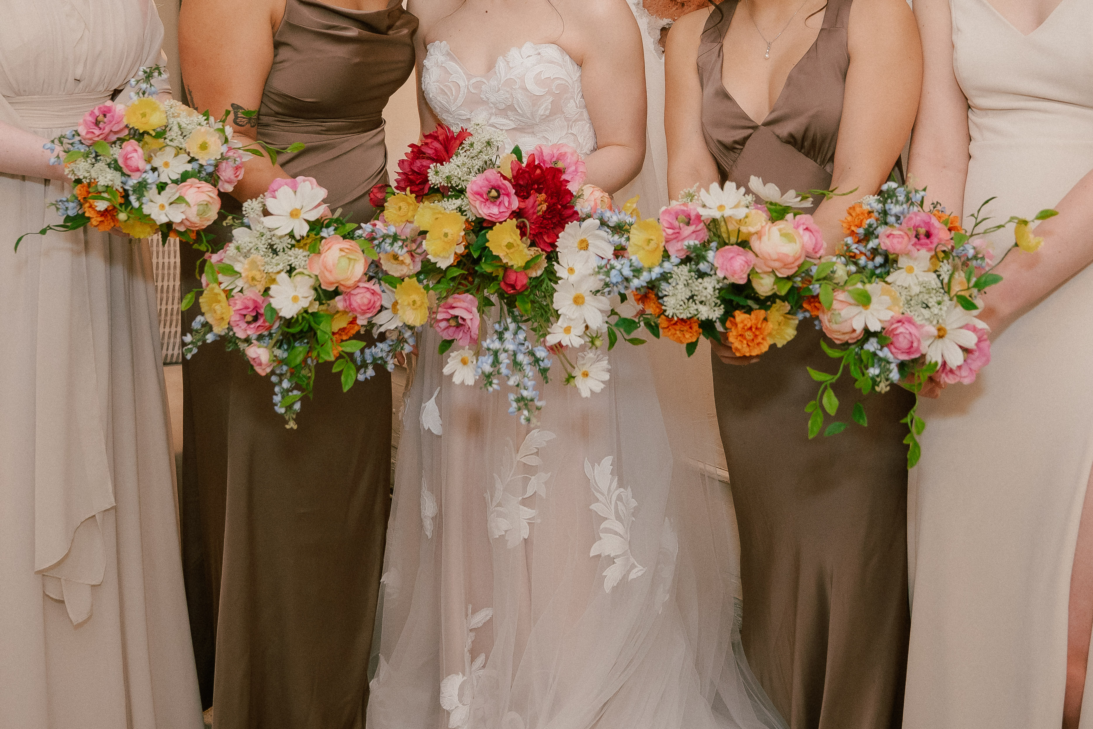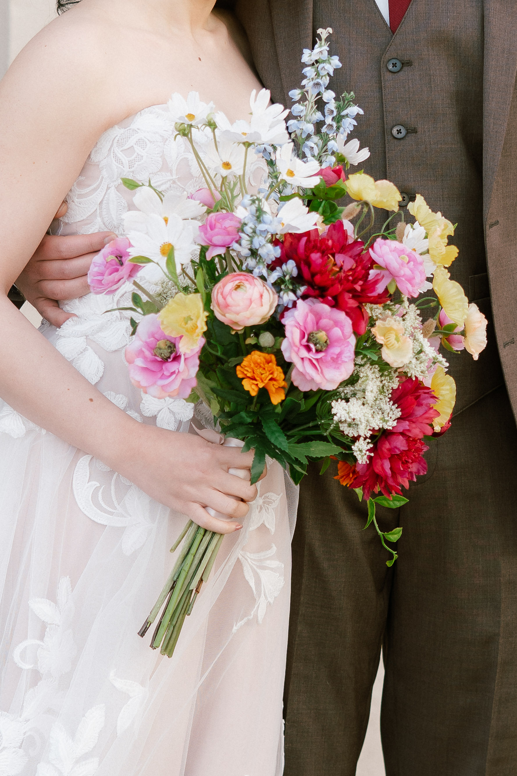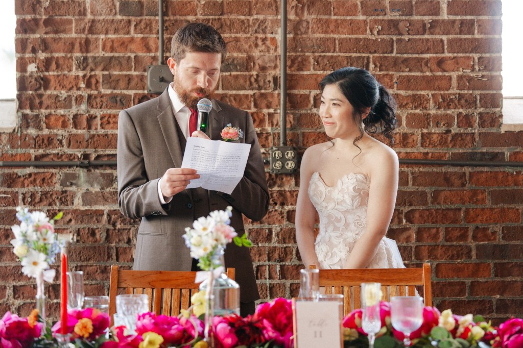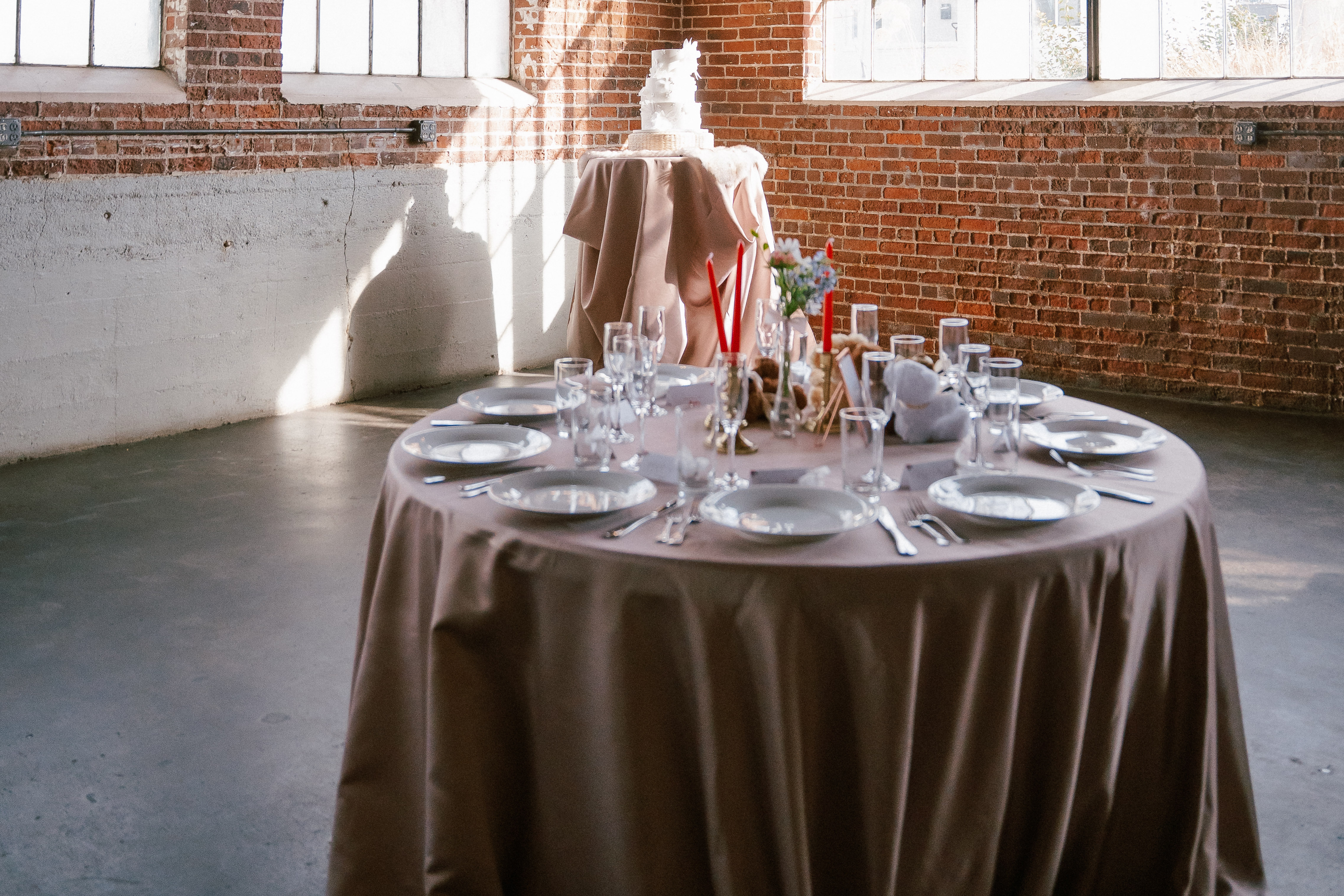 The reception space was filled with vibrant flowers that brought beautiful color throughout the venue. The floral arrangements added a lively and romantic feel that complemented the industrial character of Moss Denver perfectly.