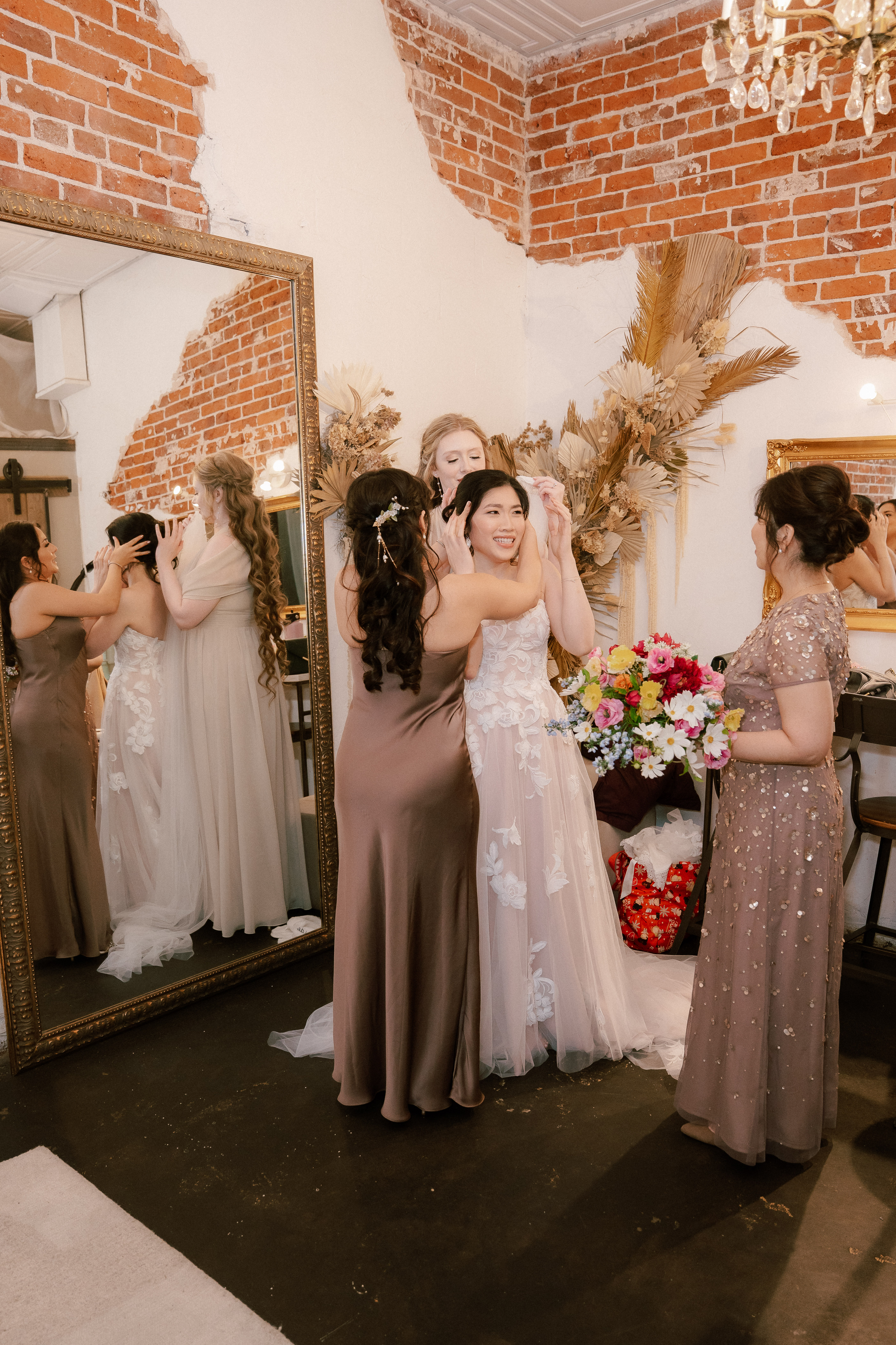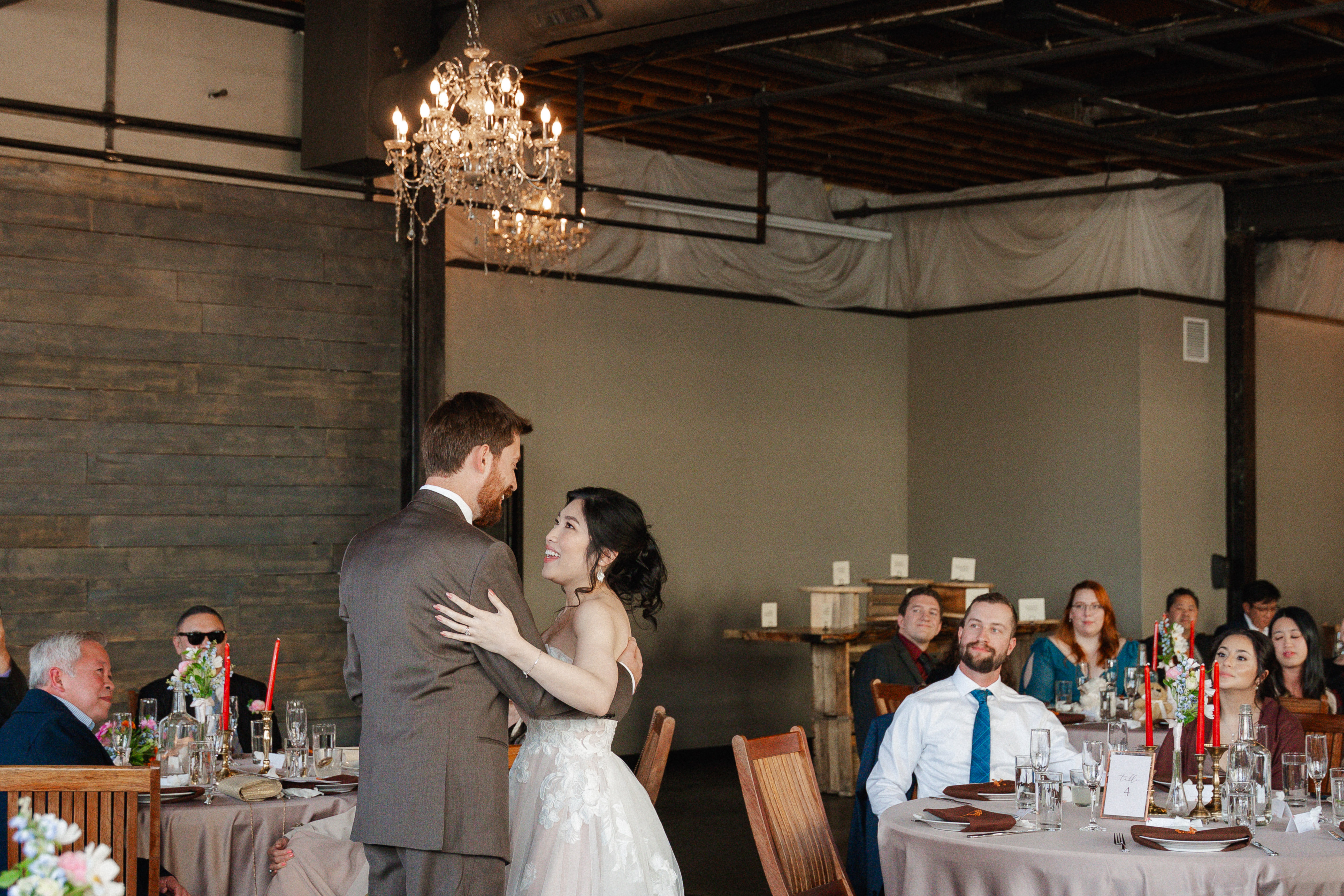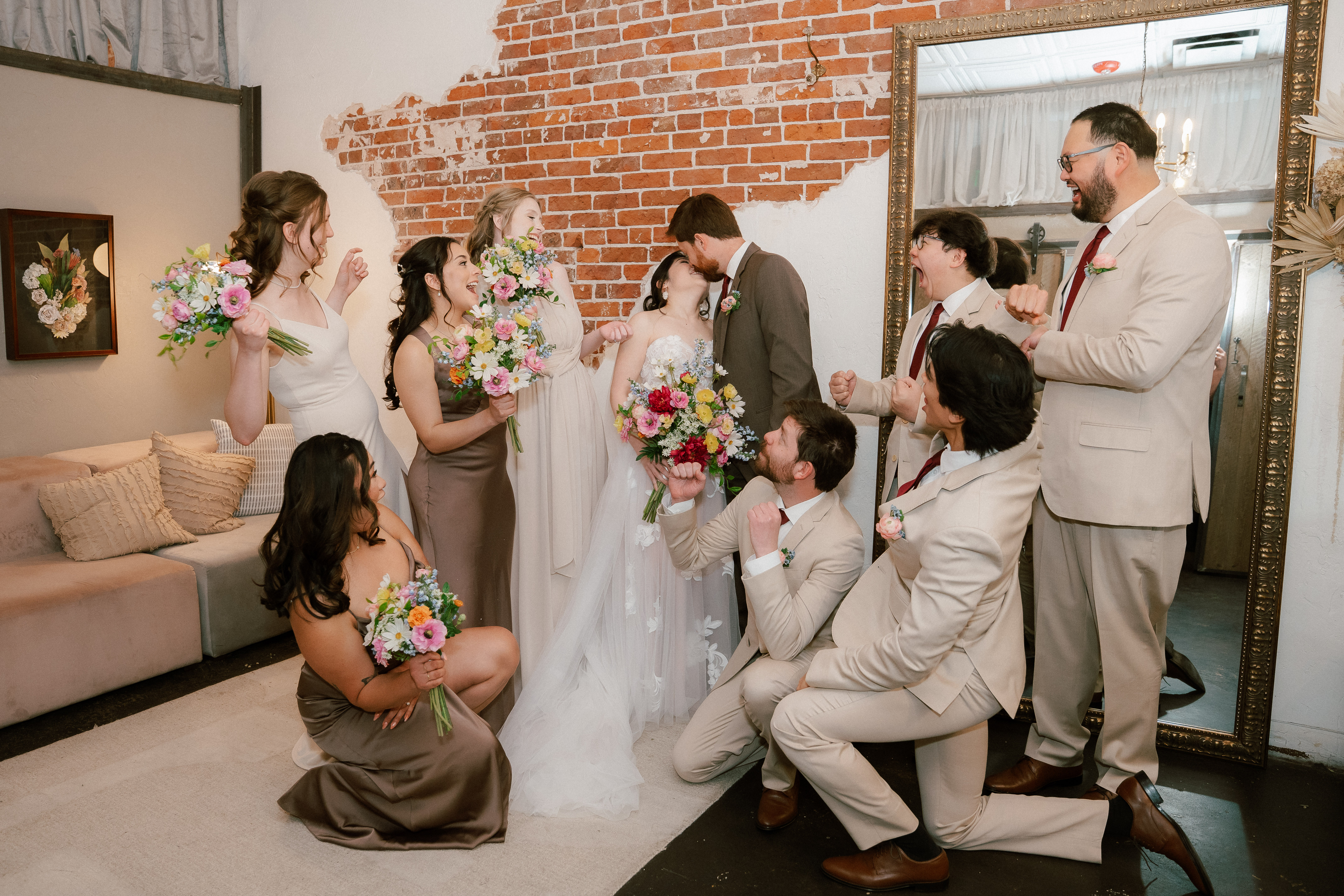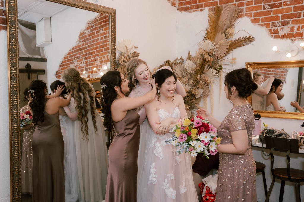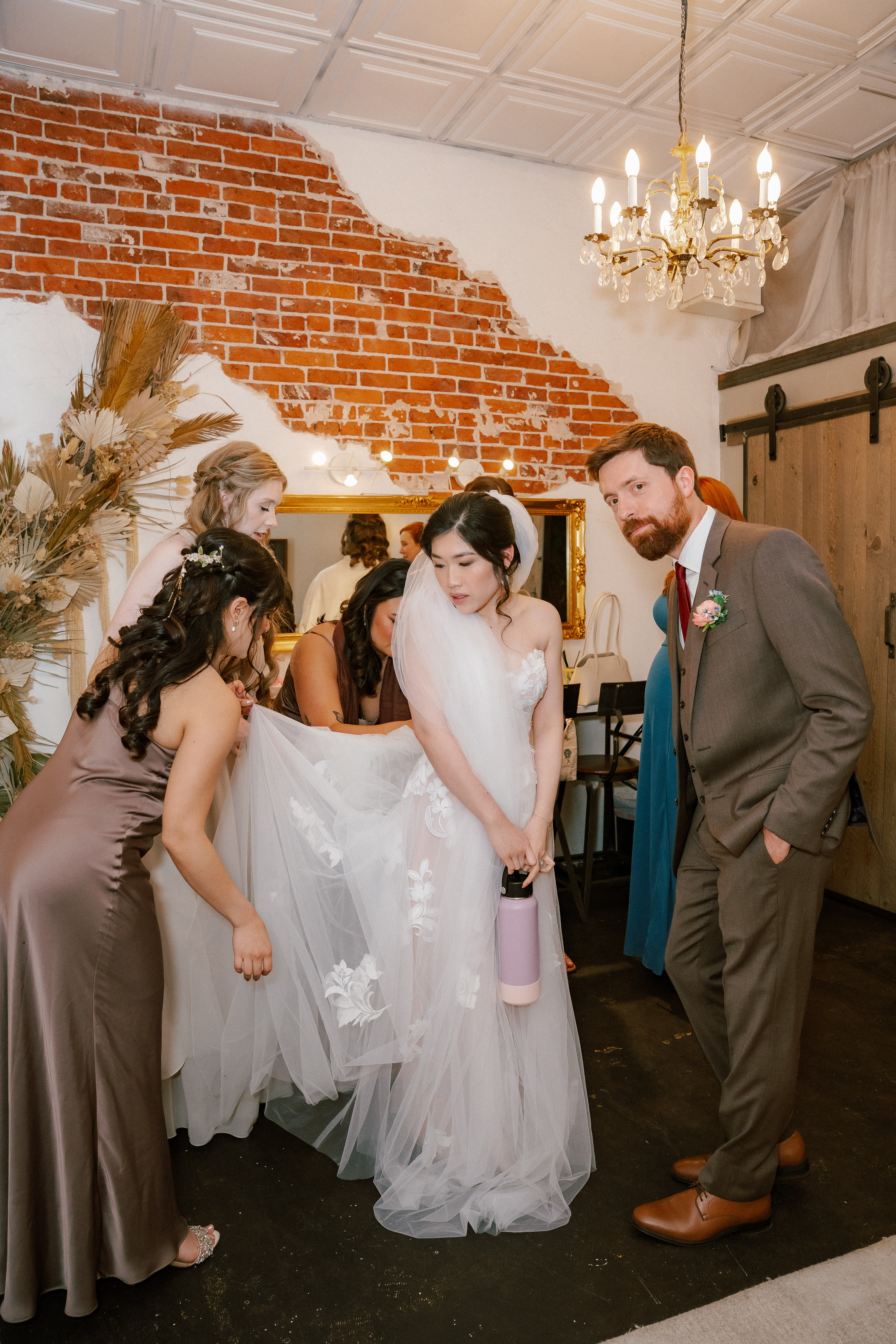 Kayla and Kolten’s early spring wedding day was a mix of cold winds and bright sunshine outside, but inside the venue, it felt cozy and inviting. The sunlight filtered beautifully through the large windows, filling the space with a soft natural glow throughout the day.