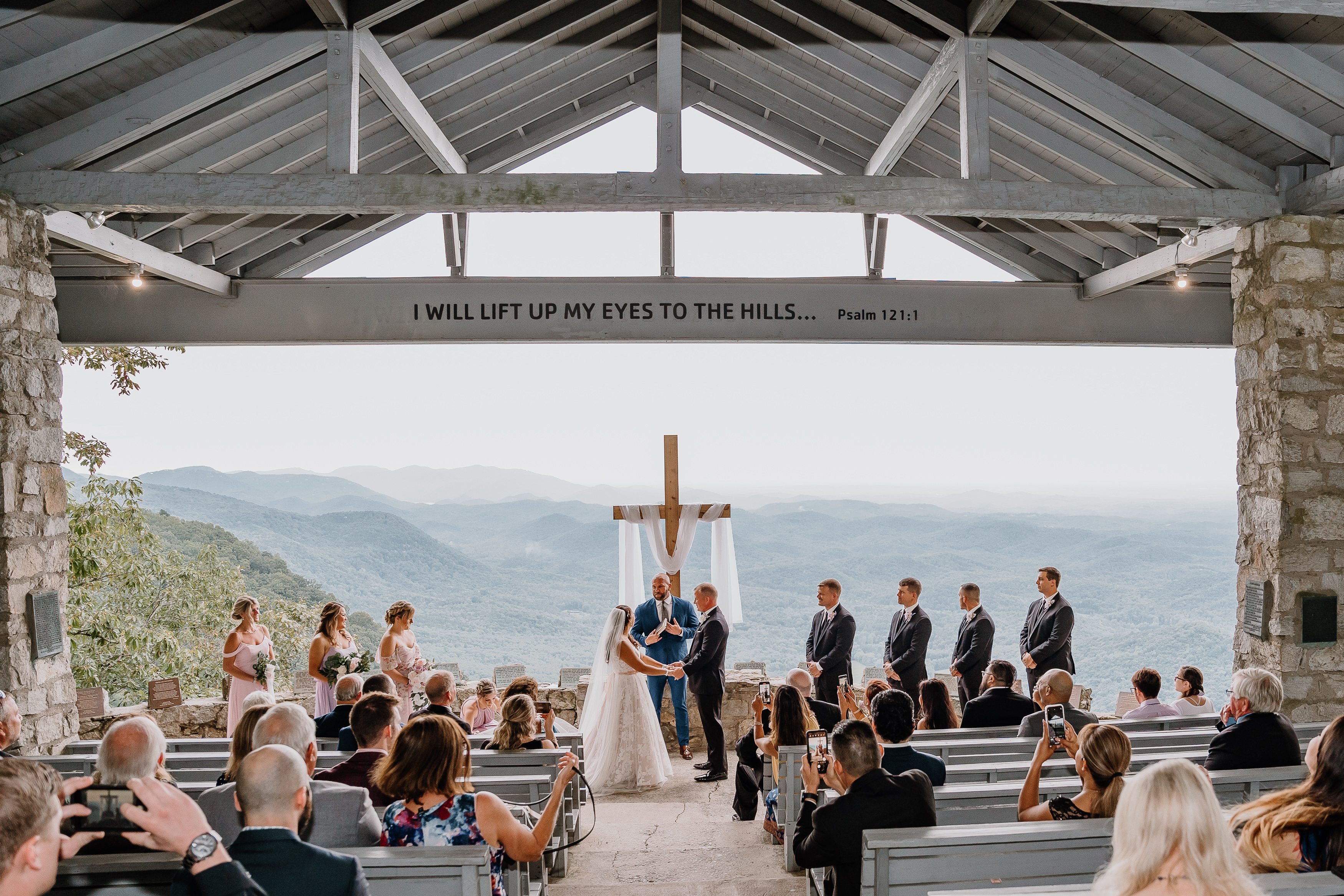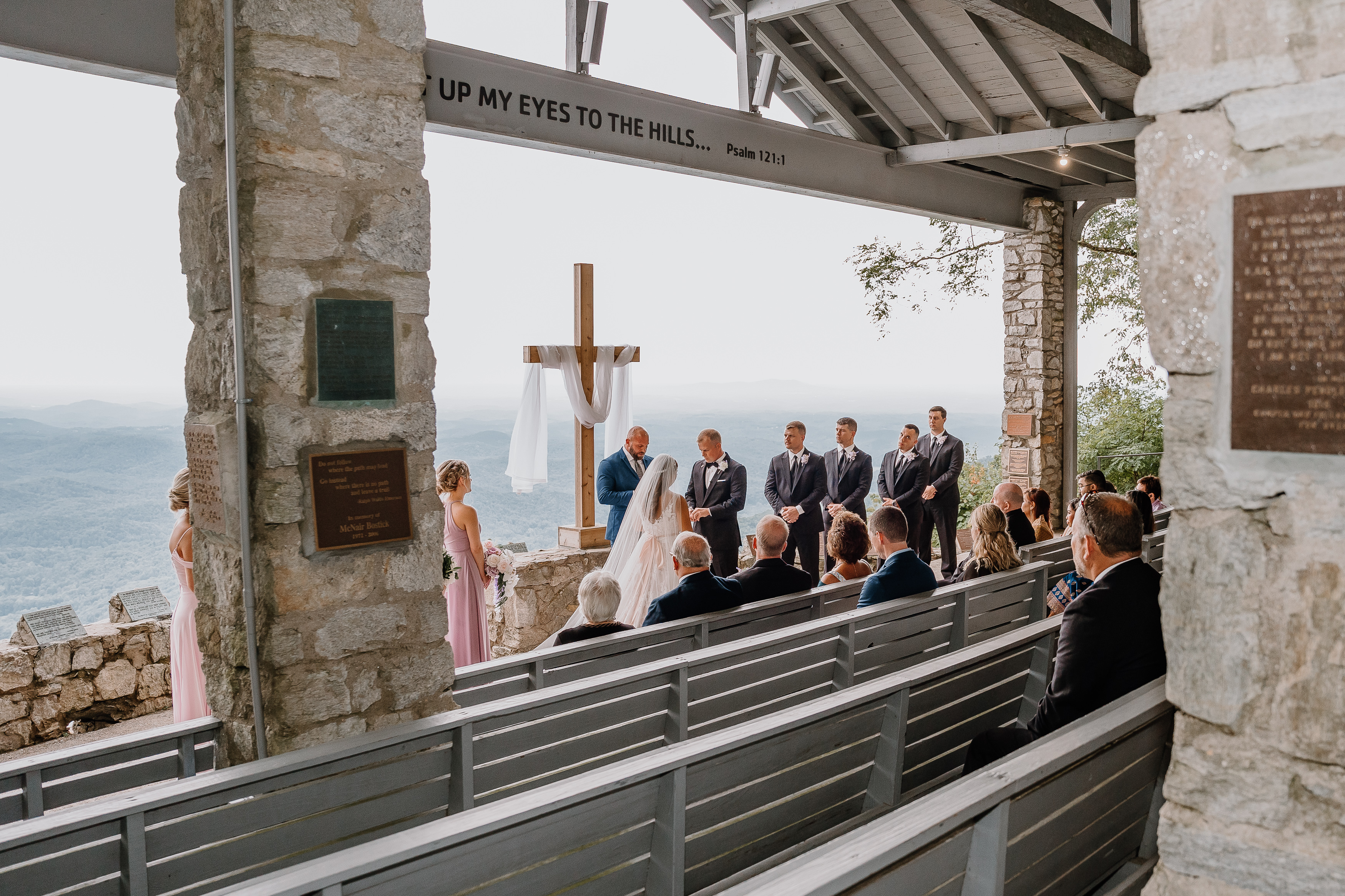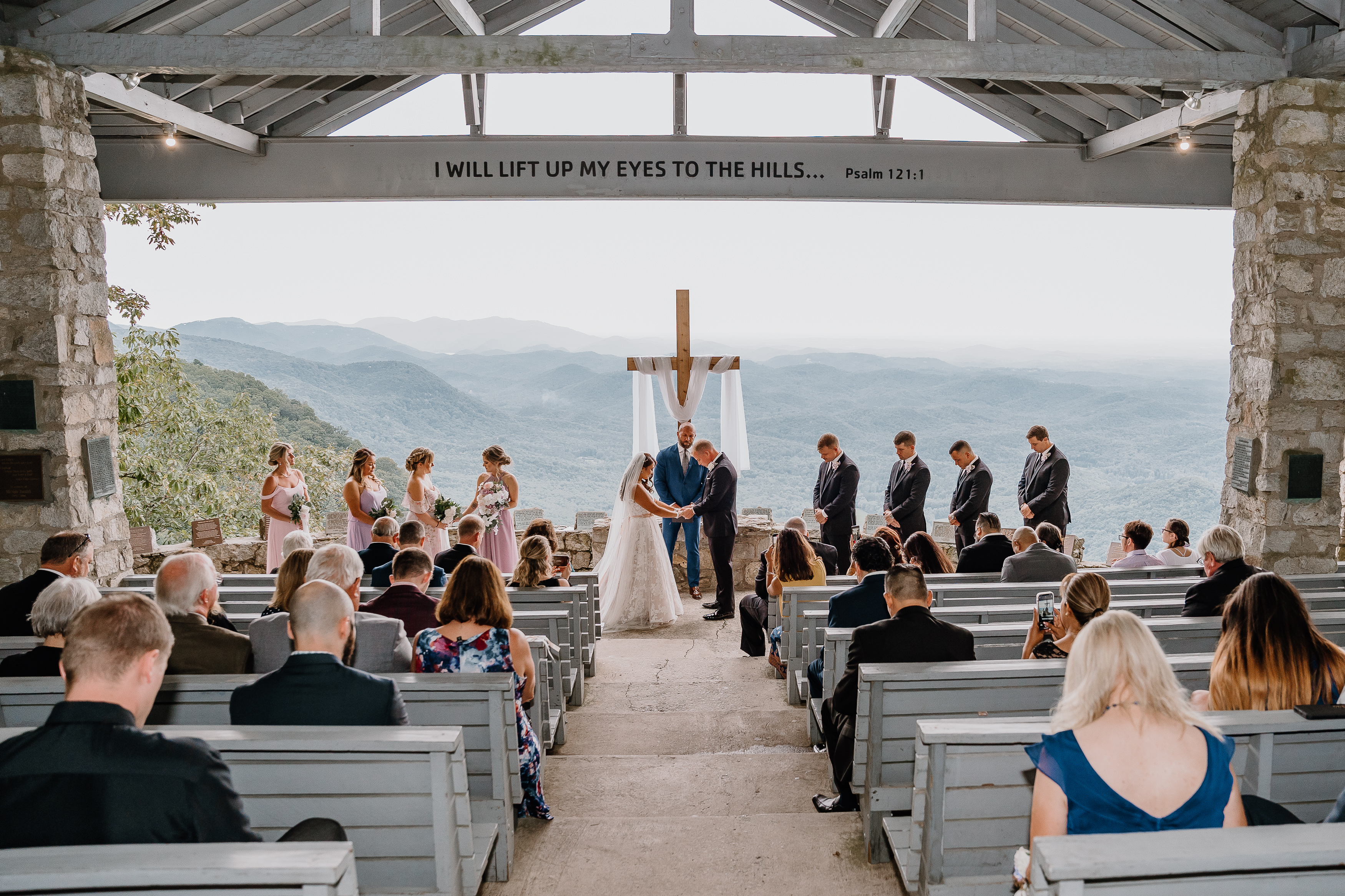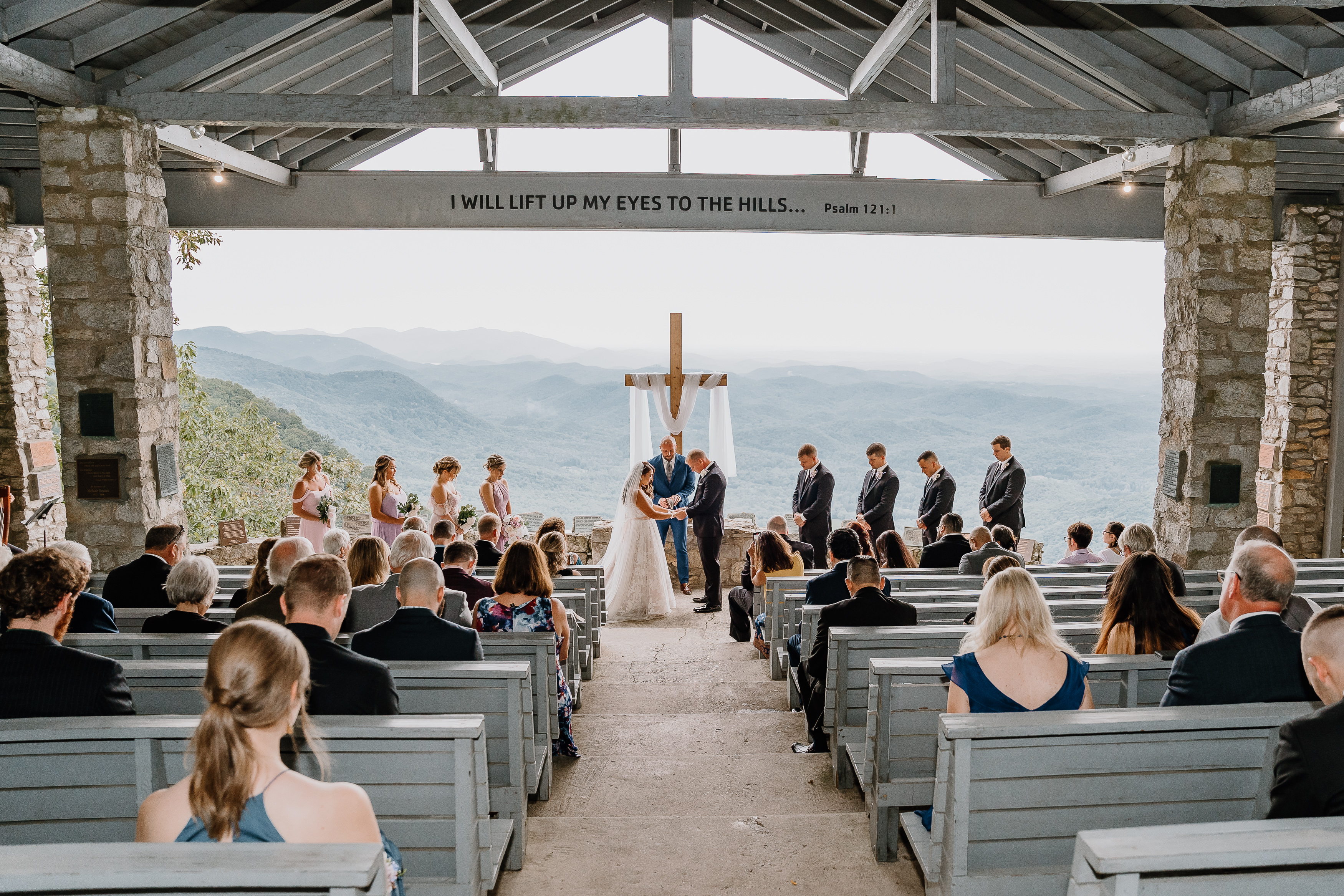 Pretty Place, also known as Symmes Chapel, sits high in the Blue Ridge Mountains and feels less like a venue and more like standing on the edge of the world. As you walk up to the open-air chapel, the first thing that hits you is the view. Rolling layers of mountains fade into soft blue tones and stretch endlessly into the horizon. There are no walls, no distractions, just sky, light, and a quiet stillness that makes every moment feel sacred.