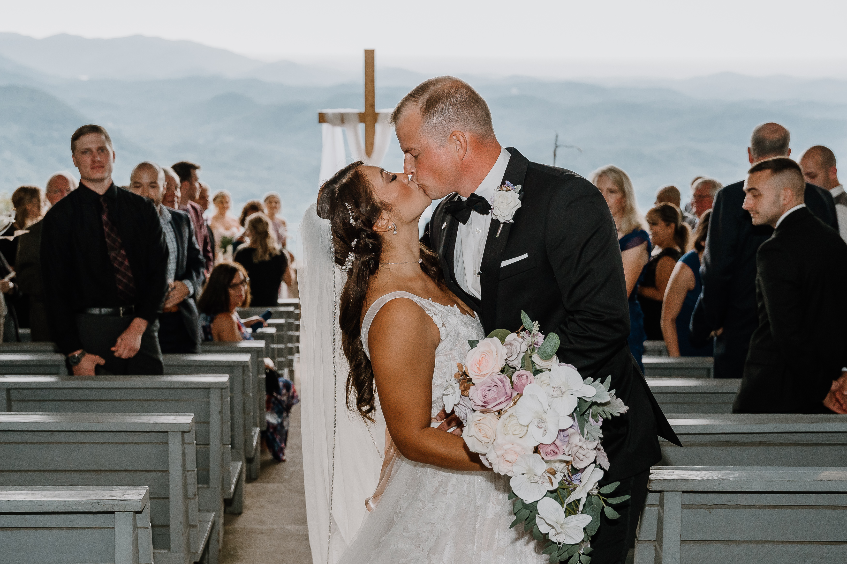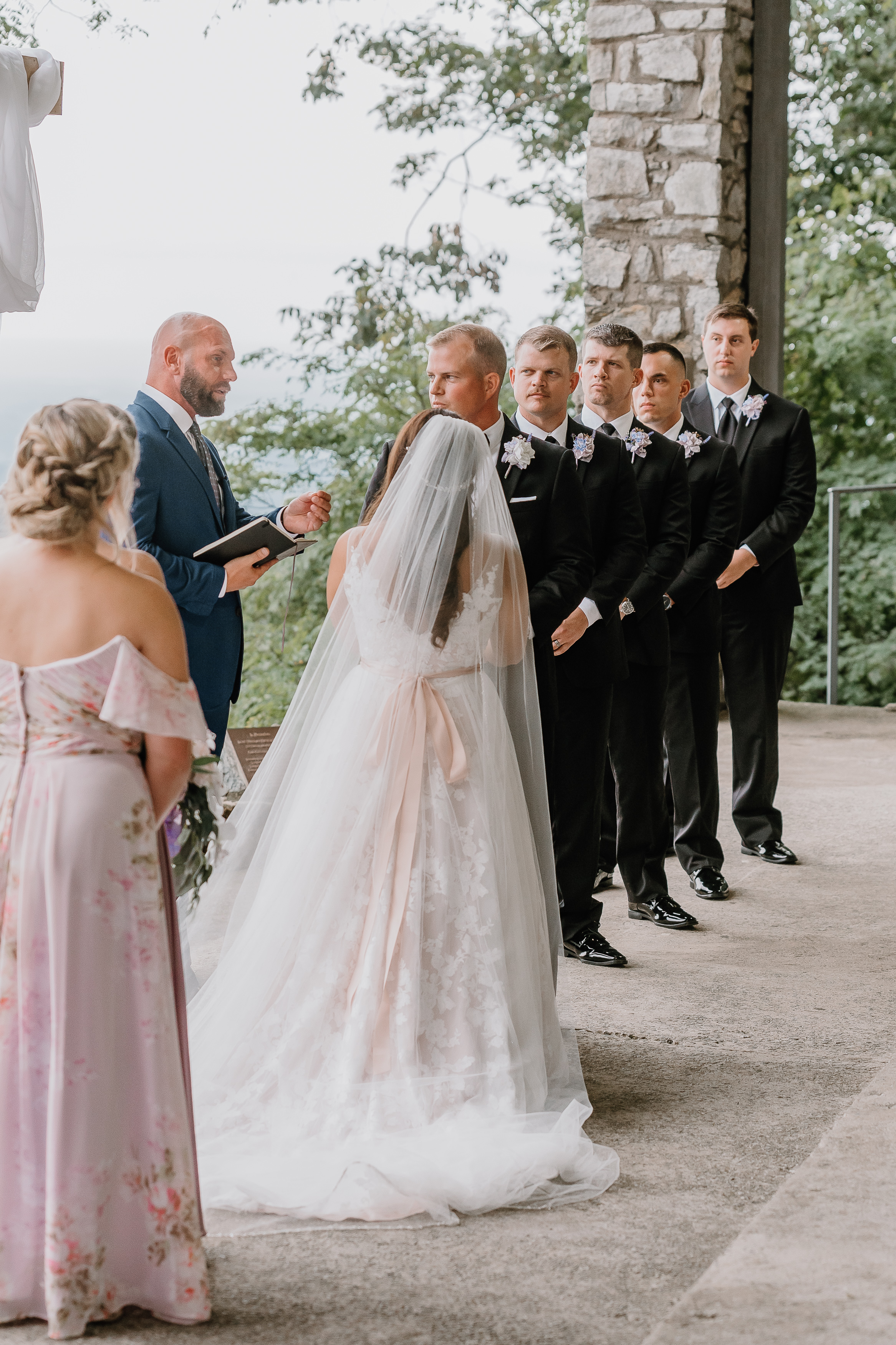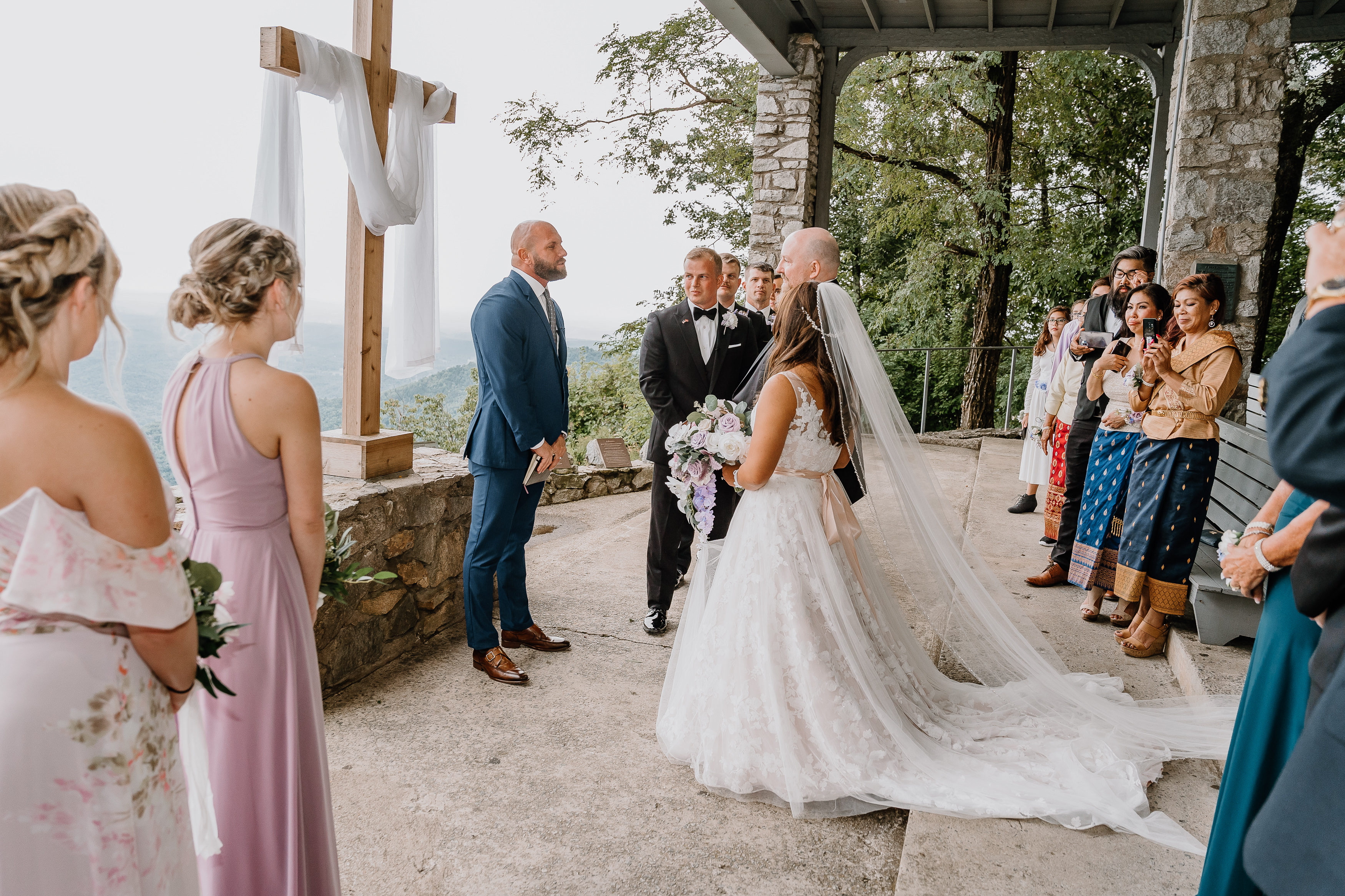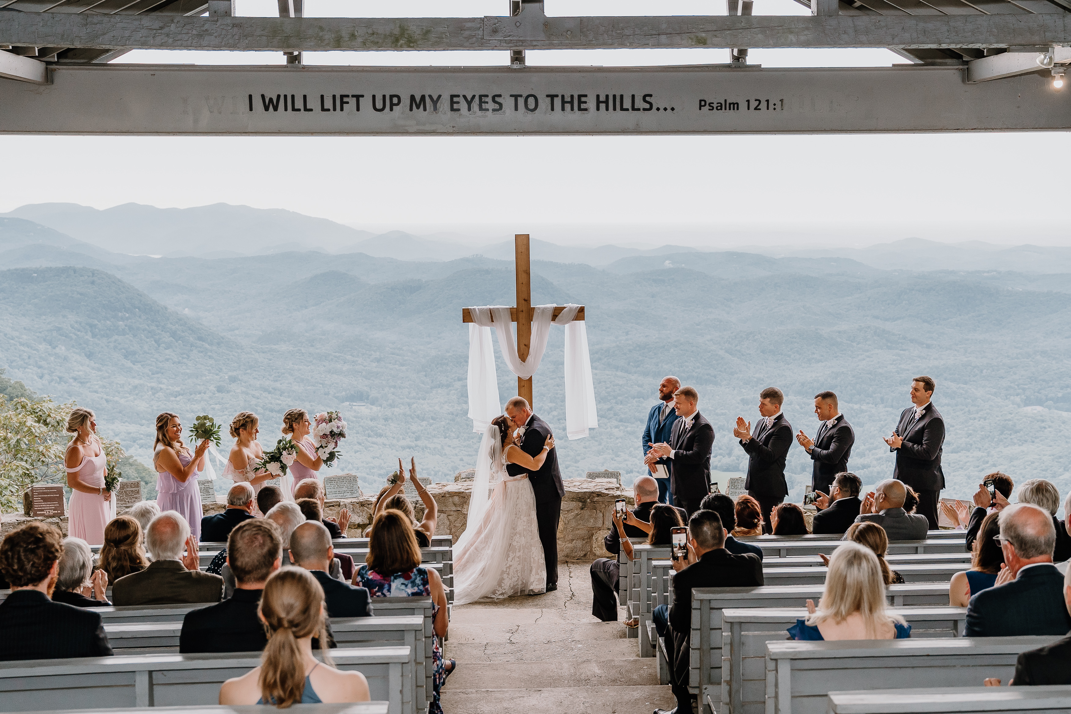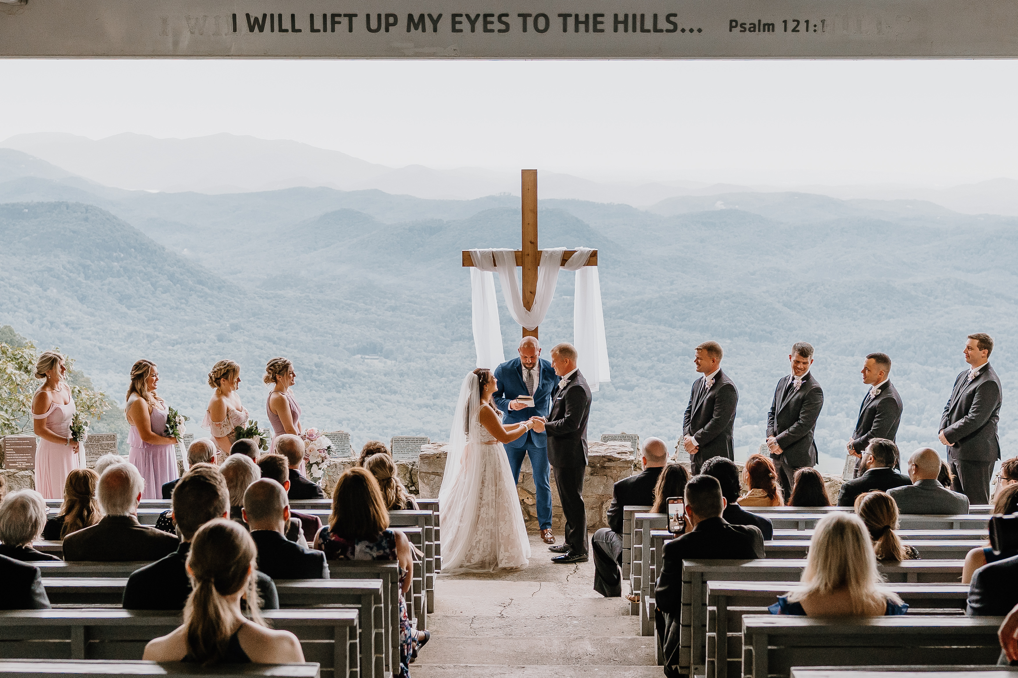 Pretty Place, also known as Symmes Chapel, sits high in the Blue Ridge Mountains and feels less like a venue and more like standing on the edge of the world. As you walk up to the open-air chapel, the first thing that hits you is the view. Rolling layers of mountains fade into soft blue tones and stretch endlessly into the horizon. There are no walls, no distractions, just sky, light, and a quiet stillness that makes every moment feel sacred.